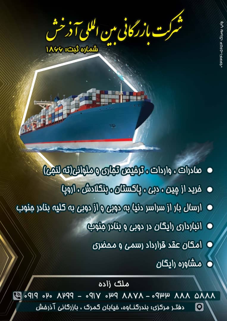 شرکت بازرگانی و کارگو آذرخش با دههها تجربه و دفاتر فعال در ایران، چین، امارات و اروپا، همراهی مطمئن تجار در صادرات، واردات و ترخیص کالا است. با ارائه کمترین نرخ کرایه حمل، بیمه رایگان و انبارداری رایگان در دوبی و بنادر جنوب، آسودگی در مدیریت محمولهها را تضمین میکند. آذرخش با تخصص در ترخیص تجاری و ملوانی (تهلنجی)، سرعت، امنیت و صرفه اقتصادی را برای تجار به ارمغان میآورد.