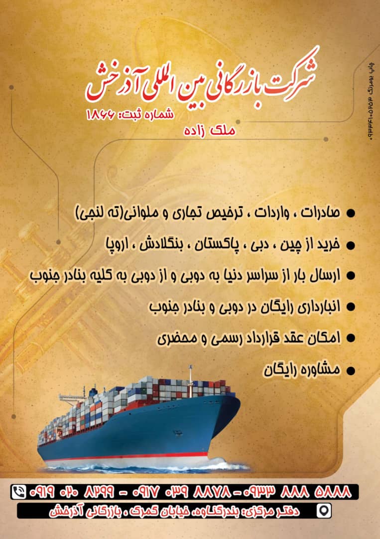 شرکت بازرگانی آذرخش گناوه با بیش از چندین دهه تجربه در زمینه واردات و صادرات کالا، به عنوان یکی از معتبرترین و پیشروترین شرکتهای فعال در جنوب ایران شناخته میشود. این شرکت با تکیه بر تخصص، تجربه و تعهد به کیفیت، توانسته است جایگاه ویژهای در حوزه تجارت بینالملل، خدمات کارگو و حمل و نقل ملوانی (ته لنجی) کسب کند و نقش مهمی در رونق اقتصادی و توسعه بازارهای داخلی و بینالمللی ایفا نماید.